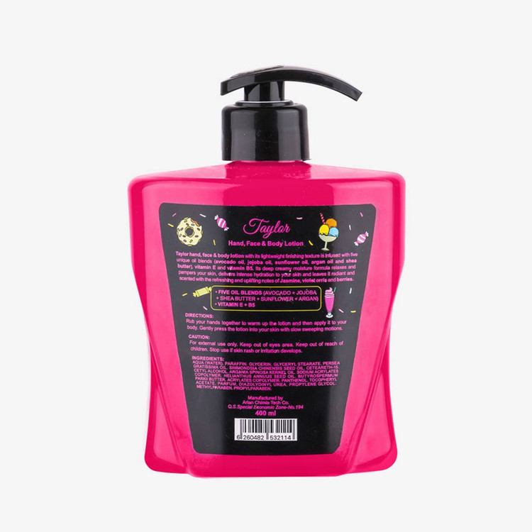 ویژگی های لوسیون دست، صورت و بدن تیلور صورتی کالیستا مغذی آبرسانی عمق مرطوب کننده نرم کننده کاهش علائم پیری زودرس با رایحه انرژی بخش و خاص میوهای – گلی مناسب انواع پوست حجم: ۴۰۰ میلی لیتر