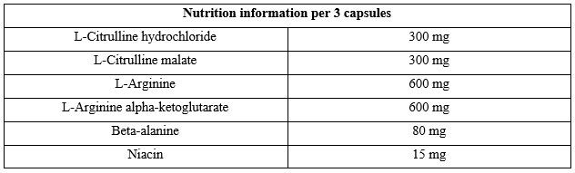 حاوی ال-سیترولین مالات، ال-سیترولین هیدروکلراید، ال-آرژینین، ال-آرژینین آلفا-کتوگلوتارات، بتا آلانین و نیاسین